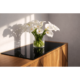 Lacquered glass sheet for desk, kitchen countertop, coffee table, glass shelf, vanity, furniture, and more. Unlike body-tinted glass (like Antisol), the black RAL9005 lacquer is applied to the bottom side, creating a deep glossy effect – it acts like a mirror in bright light. ESG tempering significantly reduces the risk of scratches compared to float glass.