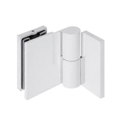 Biały zawias unoszony do kabiny prysznicowej typu ściana–szkło 90° z mocowaniem bocznym. Mechanizm unoszenia ułatwia otwieranie drzwi, zmniejsza tarcie o podłoże oraz blokuje drzwi w pozycji zamkniętej.